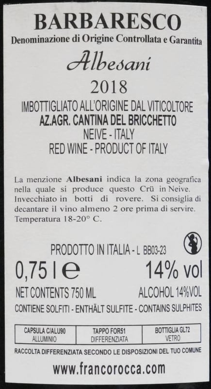 【 バックヴィンテージ 】フランコ・ロッカ バルバレスコ アルベサーニ 2018 ネッビオーロ ワイン 赤ワイン Barbaresco Albesani