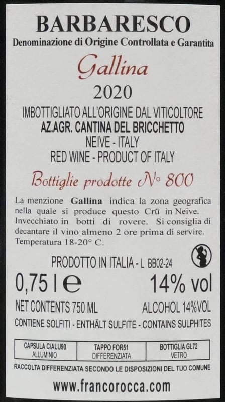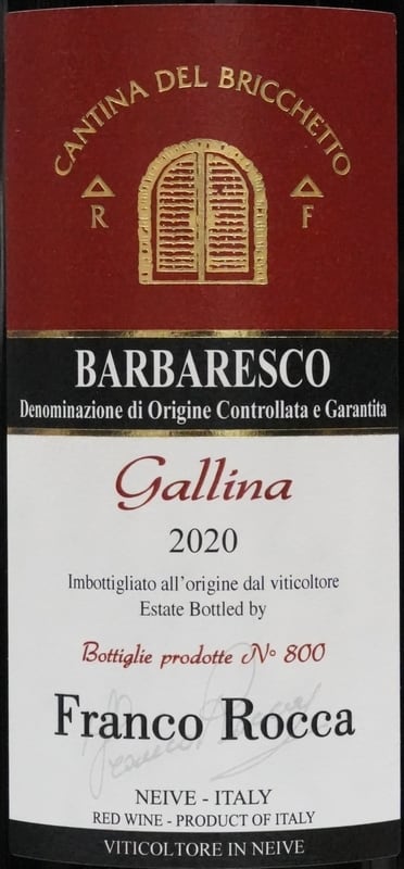 【 1樽・800本のみ生産 】フランコ・ロッカ バルバレスコ ガッリーナ 2020 ネッビオーロ 赤ワイン Barbaresco Gallina