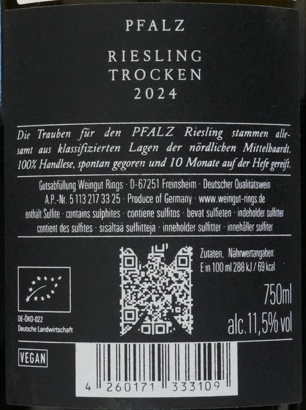【 最新ヴィンテージ 】 リングス ファルツ リースリング 2024 Rings Pfalz Riesling