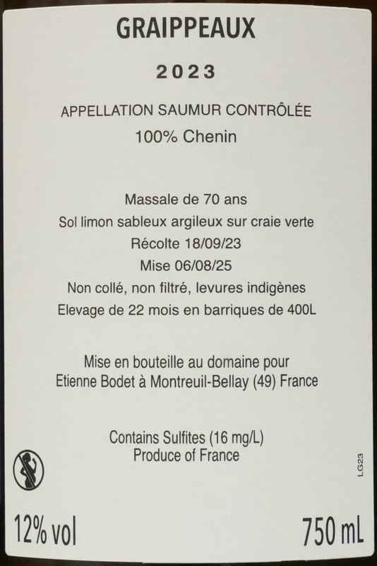 【 希少ワイン 独占販売 】 エティエンヌ ボデ 『グレポー』 シュナンブラン 2023 Etienne Bodet Graippeaux Chenin Blanc