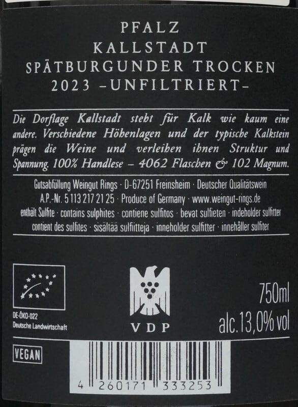 【 最新ヴィンテージ 】 リングス カールシュタット シュペートブルグンダー 2023 Rings Kallstadt Spätburgunder